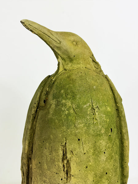 A solid, hand-cast concrete penguin statue with a naturally weathered patina and textured surface. The subtle variations and imperfections reflect the casting process, giving the piece a distinctive, characterful finish rather than a factory-perfect look.