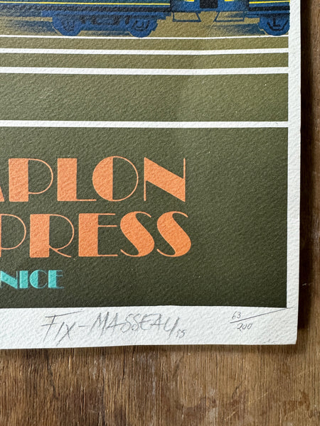 The Orient-Express, a luxury train connecting London, Paris, and Venice. Designed in the elegant Art Deco style by renowned French artist Pierre Fix-Masseau, this original vintage piece captures the romance and sophistication of classic European rail travel. A limited edition poster run made at the time of the train’s relaunch.