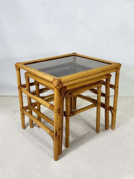 A set of vintage bamboo nest of tables. Each table features a bamboo frame with woven rattan detailing and a sleek smoked glass top, combining natural texture with a light, airy aesthetic.
