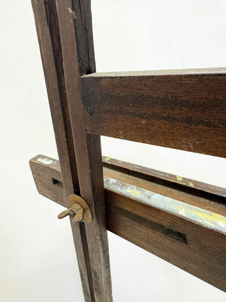 A characterful 1930's Scandinavian artist’s easel in dark timber, enriched with an authentic studio worn patina. This classic folding A-frame easel retains its original brass hardware, stabilising chain and adjustable picture ledge.