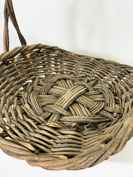 This charming vintage gathering basket is handwoven from willow with a beautifully twisted handle and rustic character. Its organic shape and warm patina make it a versatile piece for both practical use and decorative display.