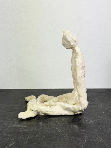 A minimalist, hand-sculpted seated figure made from clay and finished with a smooth white glaze. The elongated form and subtly textured surface reveal the artist’s hand, giving the piece a quiet, contemplative presence.
