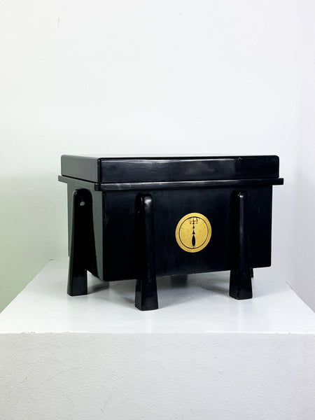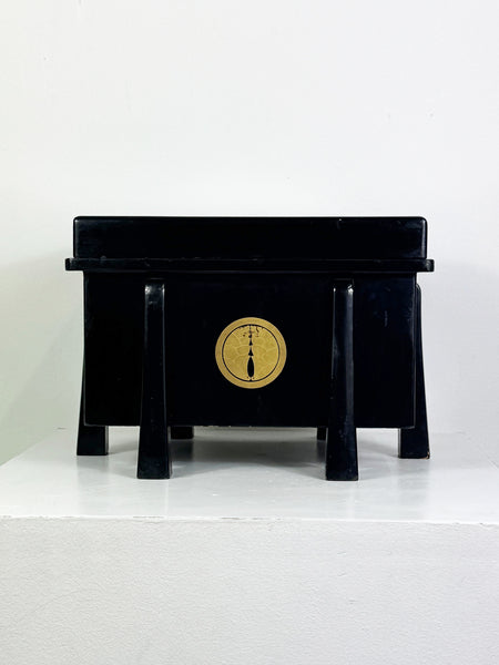 This vintage Japanese black lacquered decorative wooden storage box features a traditional gold crest motif to the front and a classic raised base design. The box has a glossy black lacquered finish with age-related surface wear consistent with use. The construction appears to be lightweight, likely lacquered papier-mâché, over a wooden base, typical of mid 20th century Japanese decorative pieces.